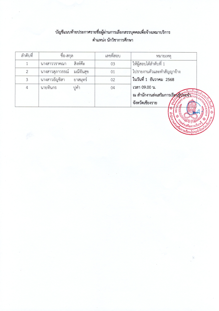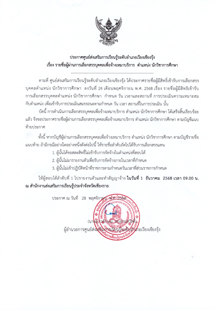 ให้ผู้เข้าสอบลำดับที่ 1 ไปรายงานตัวและทำสัญญาจ้าง ในวันที่ 1 ธันวาคม 2568 เวลา 09.00 น. ณ สำนักงานส่งเสริมการเรียนรู้ประจำจังหวัดเชียงรายเอกสารสำหรับ ทำสัญญาจ้างเหมา ตำแหน่งนักวิชาการศึกษา